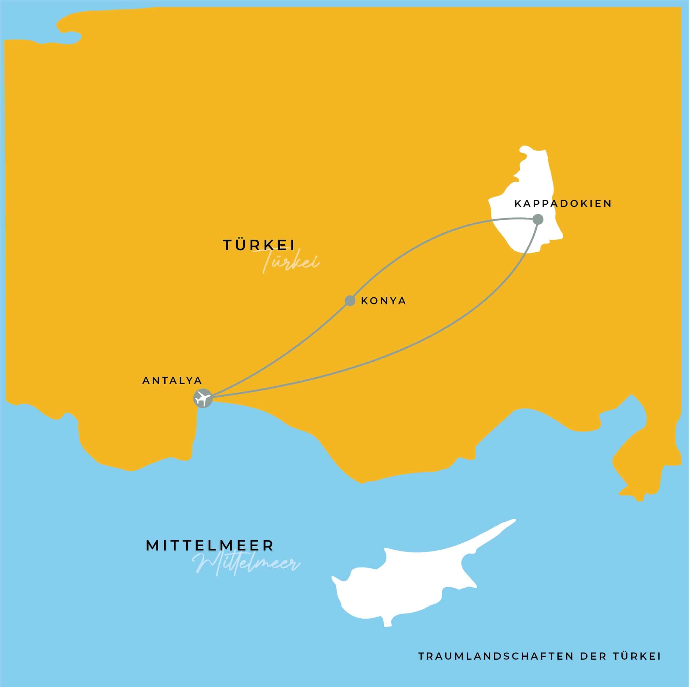 Lassen Sie sich verzaubern von der wunderbaren Landschaft Kappadokiens! Hier können Sie die kulturellen Sehenswürdigkeiten einer noch unbekannten Region der Türkei entdecken. Erleben Sie den Kontrast zwischen dem geheimnisvollen Landesinneren und der türkischen Riviera, eine der bekanntesten Küstenregionen.